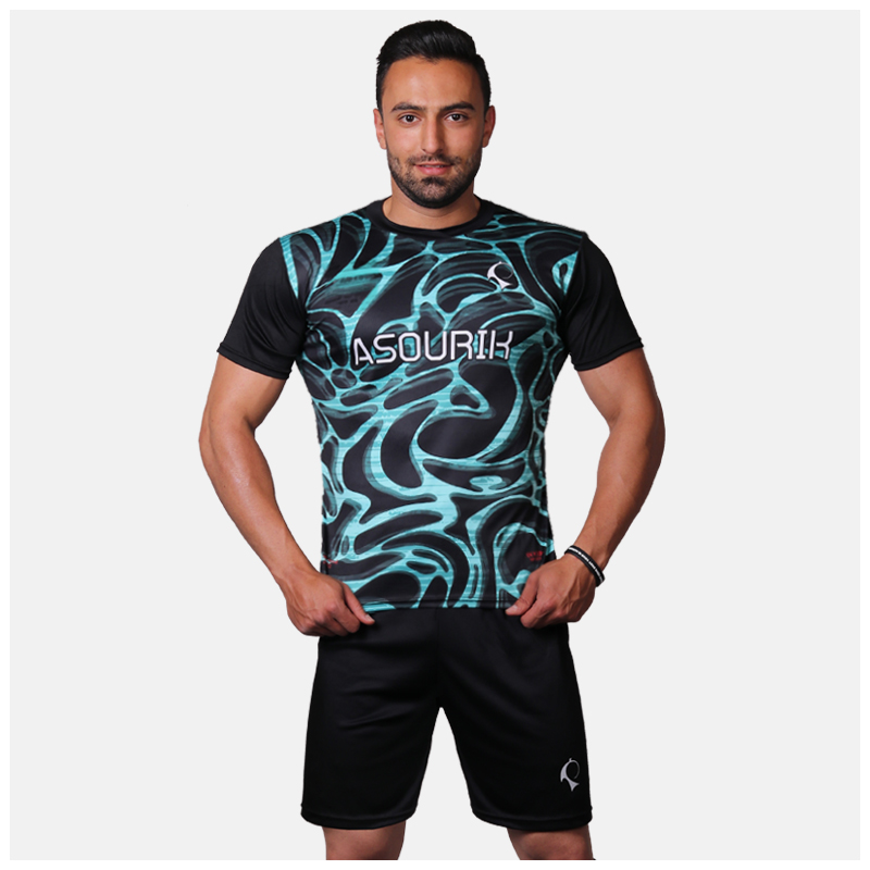 ست پیراهن و شورت ورزشی طرح موج از پارچه سوپر فلامنت کش گندمی تهیه شده است. این ست ورزشی، آستین کوتاه و یقه آن گرد روی هم می باشد. جلو و پشت لباس به روش سابلیمیشن چاپ شده است. شورت مشکی و دارای قیطان است که می توان به راحتی سایز آن را در بدن تنظیم کرد. ست پیراهن و شورت فاقد شماره و اسم می باشد که به همین جهت قابلیت افزوده شدن اسم و شماره دلخواه به لباس را دارد. در طراحی این لباس از موج های دریا تاثیر گرفته شده است که از به روز ترین طراحی های لباس ورزشی به حساب می آید. طراحی نوآورانه، یکی از هدف هایی است که آسوریک اسپرت در جهت تولید محصولی بهتر انجام می دهد. برند آسوریک، قصد دارد با نوآوری های جدید در صنعت چاپ و طراحی، محصولی قوی، با کیفیت و به روز ارائه دهد.